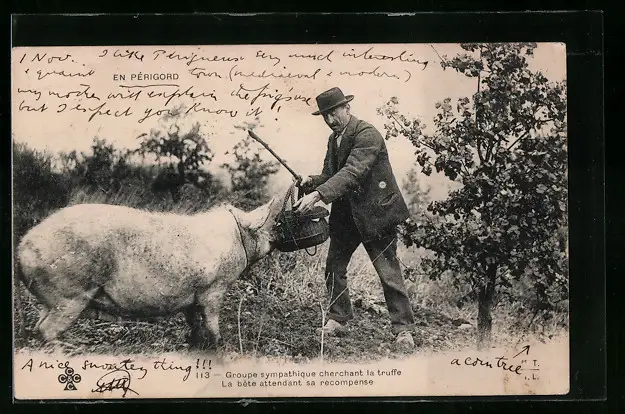 AK Mann mit Korb und erfolgreichem Trüffelschwein