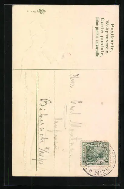 Personenbezogene Daten auf der Rückseite der Karte wurden durch blauen Textmarker unkenntlich gemacht. Die blauen Stellen sind auf die Vorderseite durchgeweicht und wirken sich negativ auf das Postkartenfoto aus