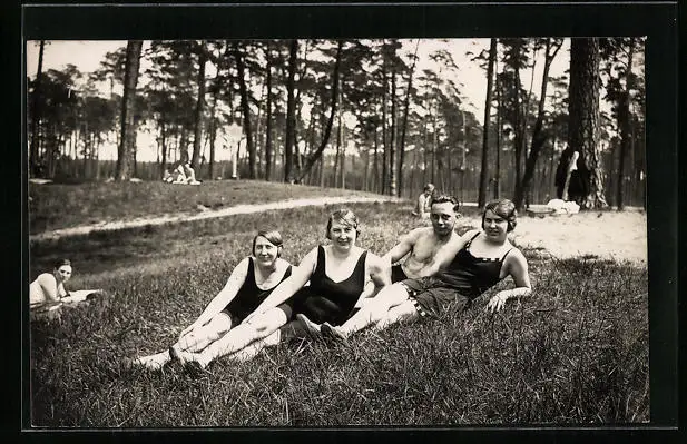 AK Mann mit drei Damen liegt in Bademode im Gras