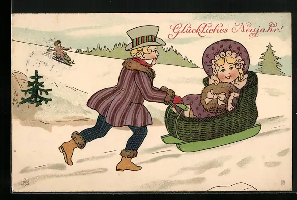AK Mann schiebt Mädchen auf dem Schlitten, Neujahrsgruss