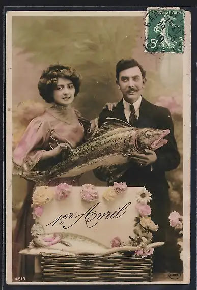 AK Mann und Frau präsentieren einen Fisch, 1. April