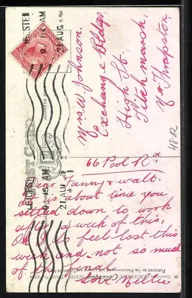 Personenbezogene Daten auf der Rückseite der Karte wurden durch blauen Textmarker unkenntlich gemacht. Die blauen Stellen sind auf die Vorderseite durchgeweicht und wirken sich negativ auf das Postkartenfoto aus