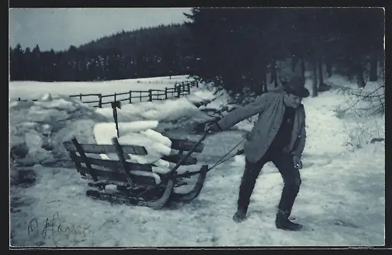 AK Mann zieht einen Schlitten im winterlichen Wald
