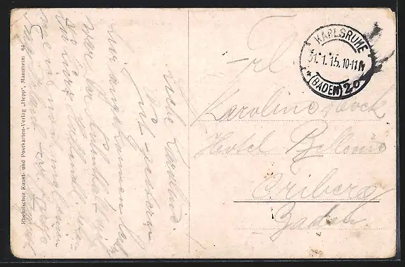 alte Ansichtskarte, gelaufen 1915, Eckknicke unten und re. oben, minimaler Eckschaden li. oben, guter Zustand