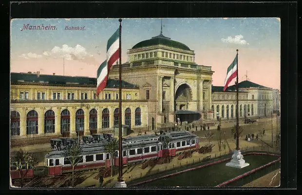 AK Mannheim, Bahnhof mit Strassenbahn