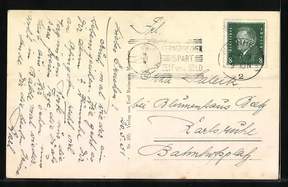 Personenbezogene Daten auf der Rückseite der Karte wurden durch blauen Textmarker unkenntlich gemacht. Die blauen Stellen sind auf die Vorderseite durchgeweicht und wirken sich negativ auf das Postkartenfoto aus