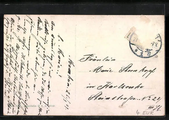 Personenbezogene Daten auf der Rückseite der Karte wurden durch blauen Textmarker unkenntlich gemacht. Die blauen Stellen sind auf die Vorderseite durchgeweicht und wirken sich negativ auf das Postkartenfoto aus