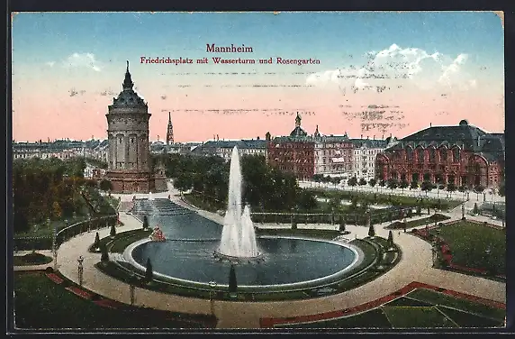 AK Mannheim, Friedrichsplatz mit Wasserturm und Rosengarten von einer Anhöhe aus gesehen