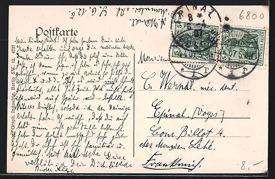 Personenbezogene Daten auf der Rückseite der Karte wurden durch blauen Textmarker unkenntlich gemacht. Die blauen Stellen sind auf die Vorderseite durchgeweicht und wirken sich negativ auf das Postkartenfoto aus
