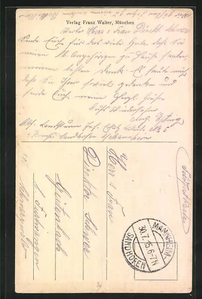 Personenbezogene Daten auf der Rückseite der Karte wurden durch blauen Textmarker unkenntlich gemacht. Die blauen Stellen sind auf die Vorderseite durchgeweicht und wirken sich negativ auf das Postkartenfoto aus