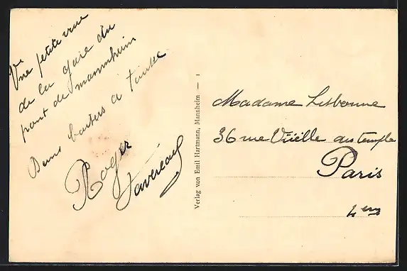 Personenbezogene Daten auf der Rückseite der Karte wurden durch blauen Textmarker unkenntlich gemacht. Die blauen Stellen sind auf die Vorderseite durchgeweicht und wirken sich negativ auf das Postkartenfoto aus