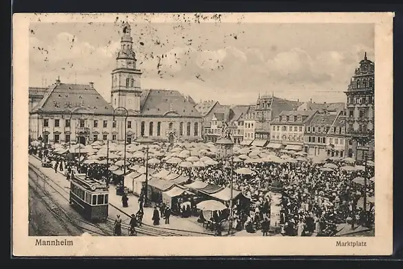 AK Mannheim, Markttag auf dem Marktplatz, Strassenbahn