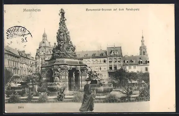 AK Mannheim, Monumental-Brunnen auf dem Paradeplatz