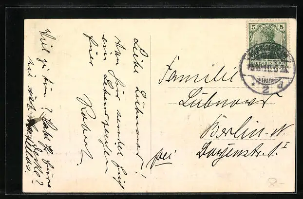 Personenbezogene Daten auf der Rückseite der Karte wurden durch blauen Textmarker unkenntlich gemacht. Die blauen Stellen sind auf die Vorderseite durchgeweicht und wirken sich negativ auf das Postkartenfoto aus