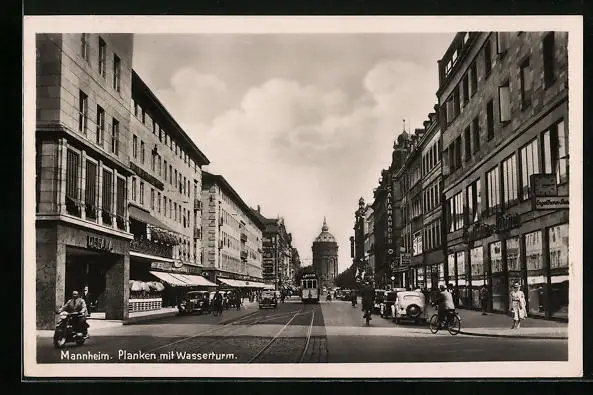 AK Mannheim, Planken mit Wasserturm und Strassenbahn