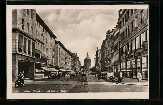 AK Mannheim, Planken mit Wasserturm und Strassenbahn