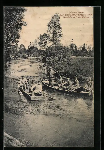 AK Mannschaften der Eisenbahnkompagnie beim Gondeln auf der Suippe