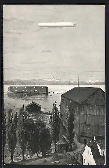 AK Manzell, Die Wiege der Zeppelin-Luftschifffahrt, Zeppelinhanger auf dem Wasser