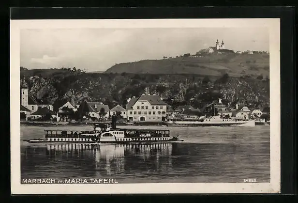 AK Marbach /Strudengau, Uferpartie mit Maria Taferl und Dampfer