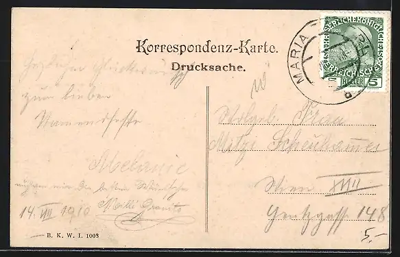 gelaufen 1910, Briefmarke entfernt, Abriebspur re. unten, guter Zustand