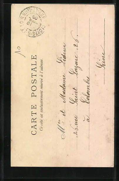 Personenbezogene Daten auf der Rückseite der Karte wurden durch blauen Textmarker unkenntlich gemacht. Die blauen Stellen sind auf die Vorderseite durchgeweicht und wirken sich negativ auf das Postkartenfoto aus
