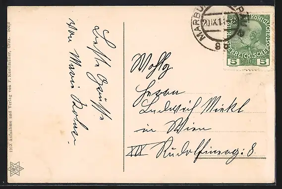 Personenbezogene Daten auf der Rückseite der Karte wurden durch blauen Textmarker unkenntlich gemacht. Die blauen Stellen sind auf die Vorderseite durchgeweicht und wirken sich negativ auf das Postkartenfoto aus