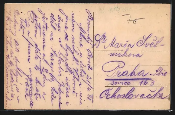 Personenbezogene Daten auf der Rückseite der Karte wurden durch blauen Textmarker unkenntlich gemacht. Die blauen Stellen sind auf die Vorderseite durchgeweicht und wirken sich negativ auf das Postkartenfoto aus