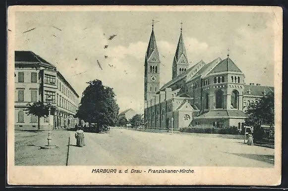 AK Marburg a. d. Drau, Strassenpartie mit Franziskaner-Kirche