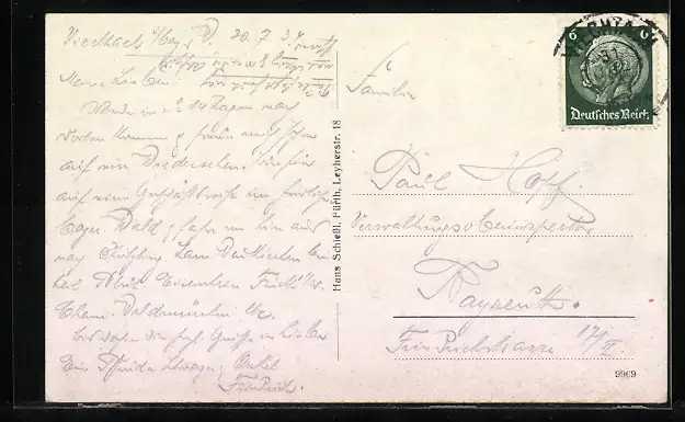 Personenbezogene Daten auf der Rückseite der Karte wurden durch blauen Textmarker unkenntlich gemacht. Die blauen Stellen sind auf die Vorderseite durchgeweicht und wirken sich negativ auf das Postkartenfoto aus