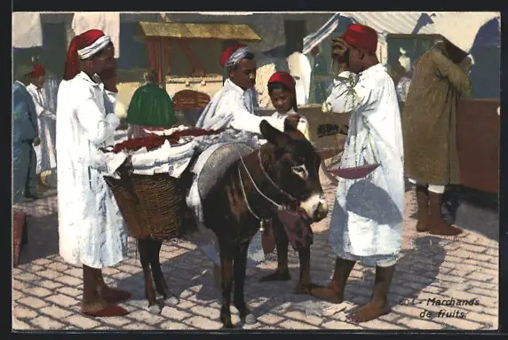AK Marchands de fruits, arabischer Händler mit Esel auf dem Markt