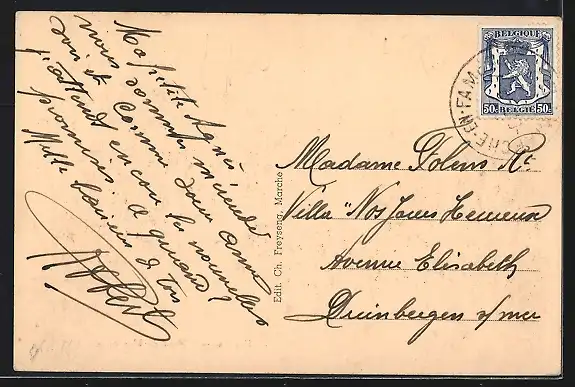 Personenbezogene Daten auf der Rückseite der Karte wurden durch blauen Textmarker unkenntlich gemacht. Die blauen Stellen sind auf die Vorderseite durchgeweicht und wirken sich negativ auf das Postkartenfoto aus