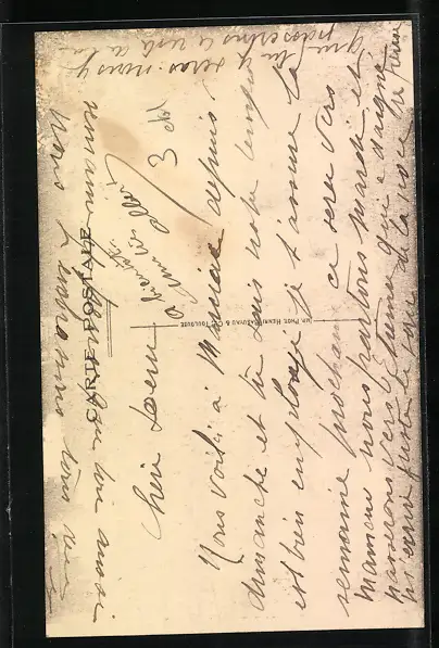 Personenbezogene Daten auf der Rückseite der Karte wurden durch blauen Textmarker unkenntlich gemacht. Die blauen Stellen sind auf die Vorderseite durchgeweicht und wirken sich negativ auf das Postkartenfoto aus