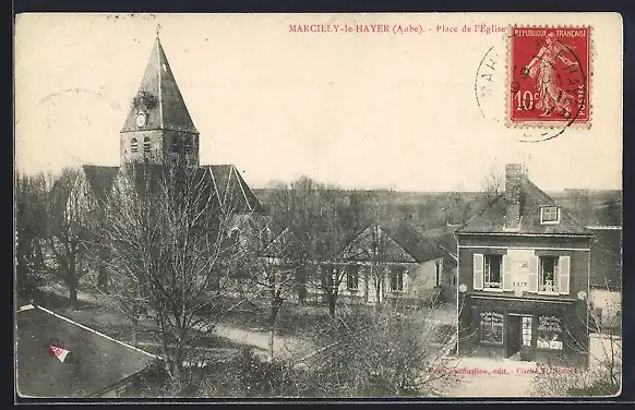 AK Marcilly-le-Hayer, Place de l`Église et vue sur le clocher