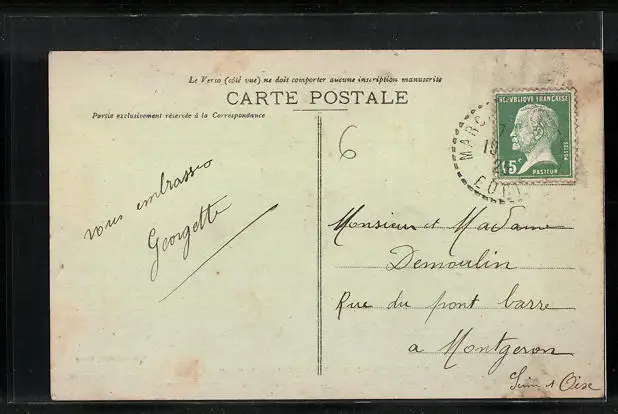 Personenbezogene Daten auf der Rückseite der Karte wurden durch blauen Textmarker unkenntlich gemacht. Die blauen Stellen sind auf die Vorderseite durchgeweicht und wirken sich negativ auf das Postkartenfoto aus