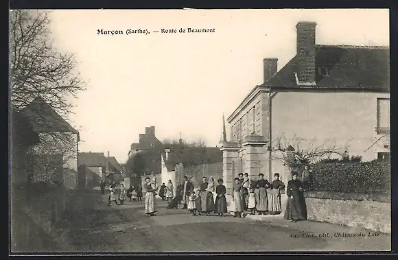 AK Marcon, Route de Beaumont avec villageois devant les maisons