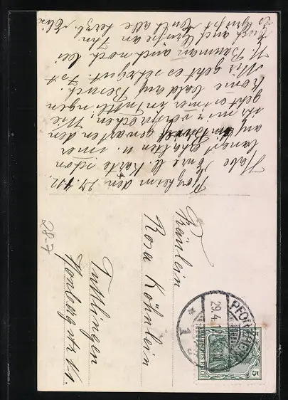 Personenbezogene Daten auf der Rückseite der Karte wurden durch blauen Textmarker unkenntlich gemacht. Die blauen Stellen sind auf die Vorderseite durchgeweicht und wirken sich negativ auf das Postkartenfoto aus