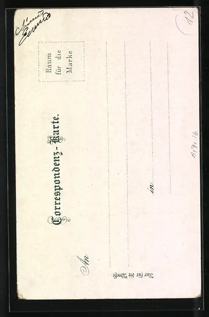Personenbezogene Daten auf der Rückseite der Karte wurden durch blauen Textmarker unkenntlich gemacht. Die blauen Stellen sind auf die Vorderseite durchgeweicht und wirken sich negativ auf das Postkartenfoto aus