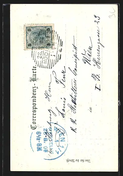 Personenbezogene Daten auf der Rückseite der Karte wurden durch blauen Textmarker unkenntlich gemacht. Die blauen Stellen sind auf die Vorderseite durchgeweicht und wirken sich negativ auf das Postkartenfoto aus