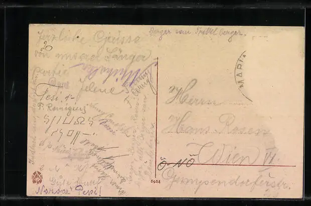 Personenbezogene Daten auf der Rückseite der Karte wurden durch blauen Textmarker unkenntlich gemacht. Die blauen Stellen sind auf die Vorderseite durchgeweicht und wirken sich negativ auf das Postkartenfoto aus