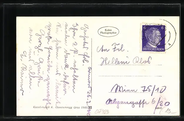 Personenbezogene Daten auf der Rückseite der Karte wurden durch blauen Textmarker unkenntlich gemacht. Die blauen Stellen sind auf die Vorderseite durchgeweicht und wirken sich negativ auf das Postkartenfoto aus