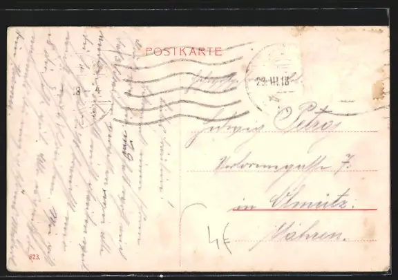 gelaufen 1918, Briefmarke entfernt, rückseitig Oberflächenschaden, guter Zustand
