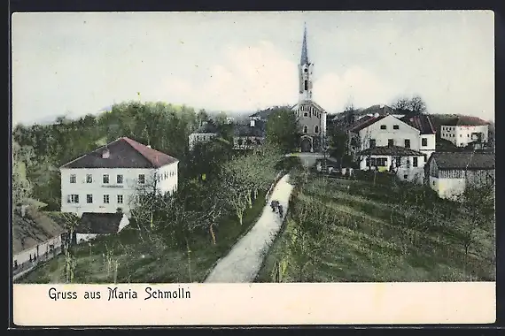 AK Maria Schmolln, Ortspartie mit Blick auf die Kirche