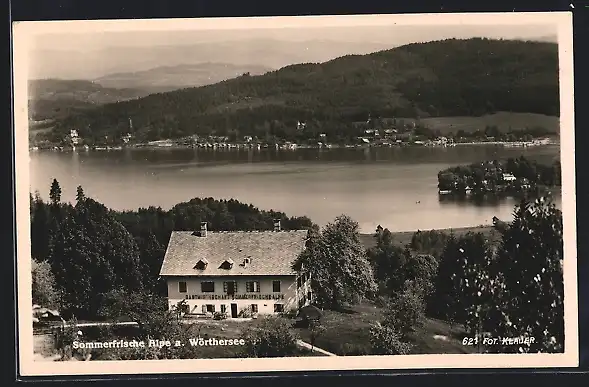 AK Maria Wörth, Gasthaus-Sommerfrische Alpe mit See aus der Vogelschau