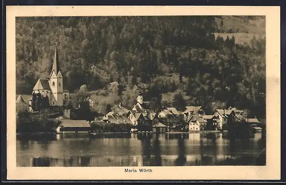 AK Maria Wörth, Ortsansicht mit Kirche vom Wasser aus