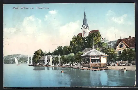 AK Maria Wörth, Uferpartie mit Gasthaus Marian, Kirche und Pavillon