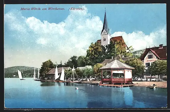 AK Maria Wörth am Wörthersee, Uferpartie mit Segelbooten und Kirche