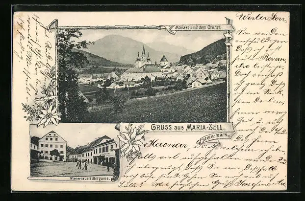 AK Maria Zell, Ortsansicht mit dem Ötscher, Wienerneustädtergasse