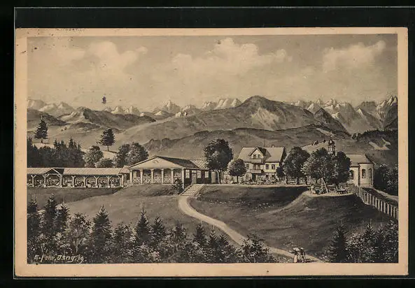 AK Mariaberg bei Kempten, Ortsansicht mit Alpenpanorama