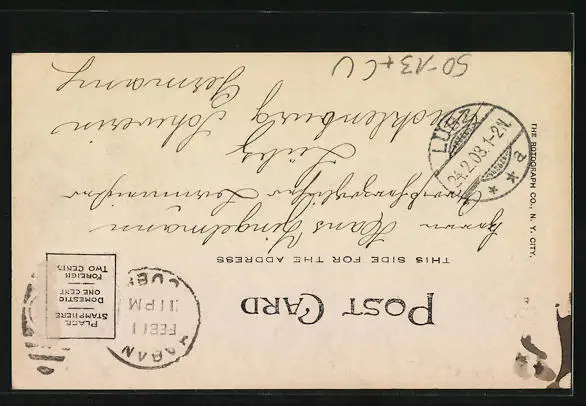 Personenbezogene Daten auf der Rückseite der Karte wurden durch blauen Textmarker unkenntlich gemacht. Die blauen Stellen sind auf die Vorderseite durchgeweicht und wirken sich negativ auf das Postkartenfoto aus