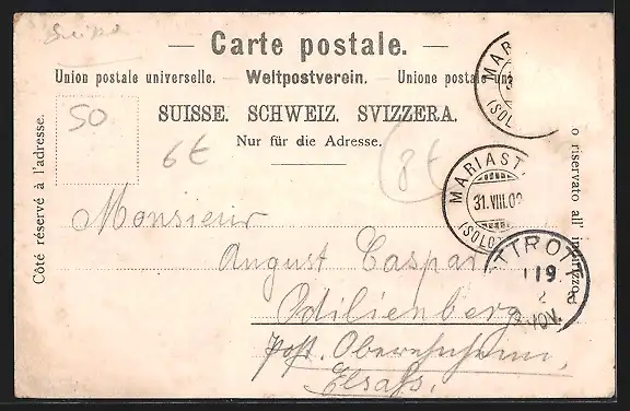 alte Ansichtskarte, gelaufen 1902, Briefmarke entfernt, rückseitig Oberflächenschaden, Abriebspuren re. oben u. unten, guter Zustand